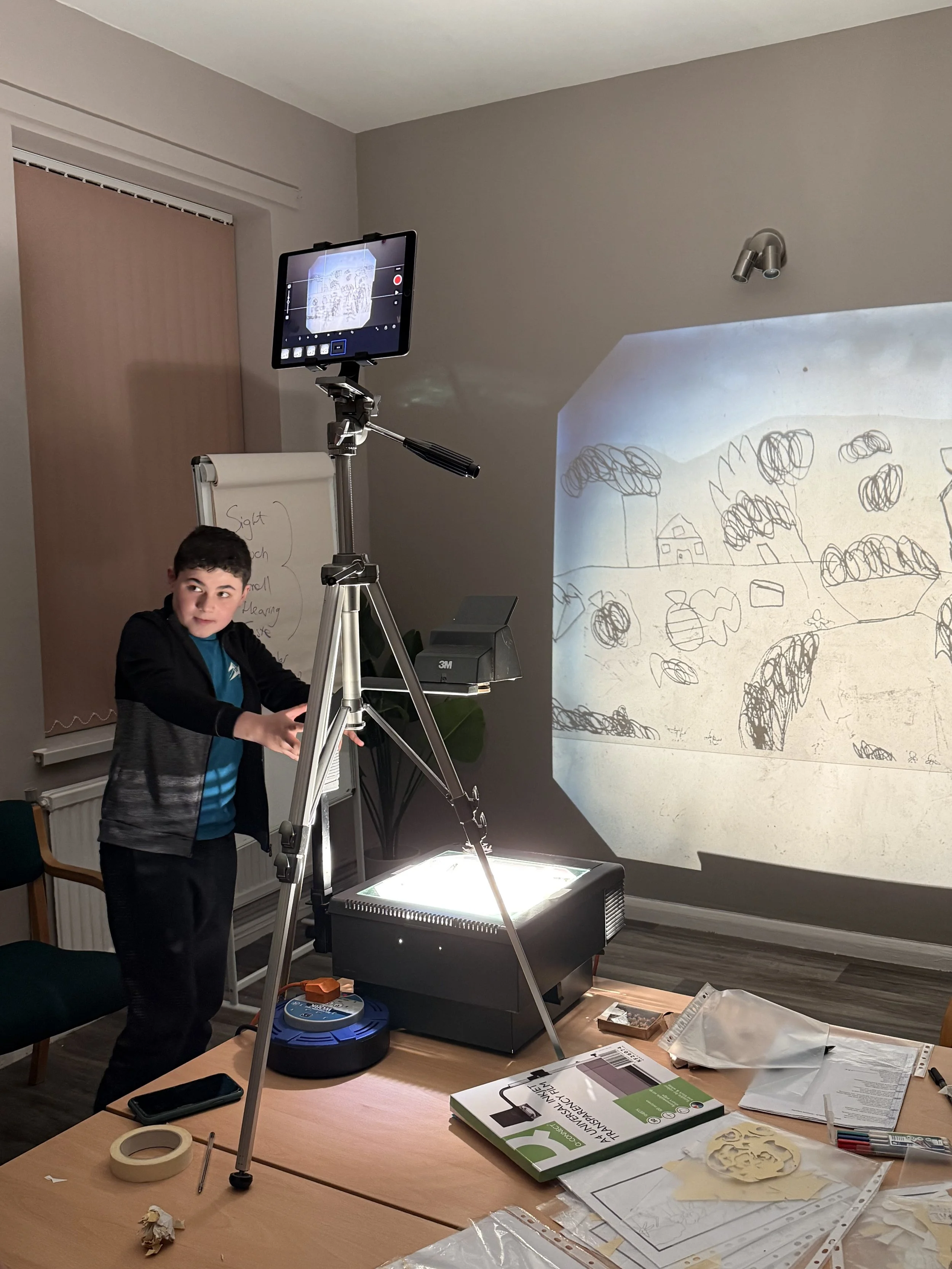 Across eight sessions, the group explored how light, shape, and movement can tell our story. They began by designing and crafting the characters that would appear in their piece, carefully cutting and experimenting with materials to see how each element came alive under the projector.